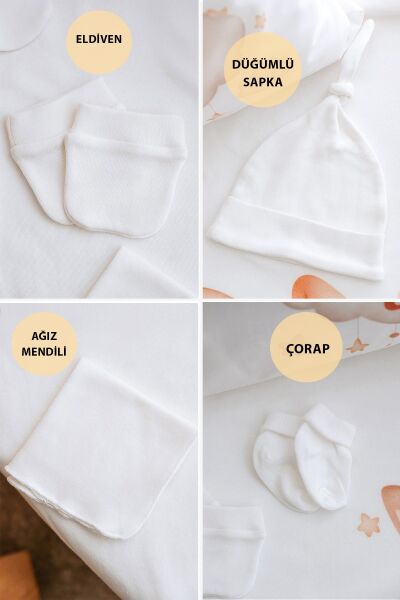 Bebeğinizin hassas cildine özel %100 pamuk materyalden üretilmiştir, yumuşak dokusuyla bebeğinizin konforunu ön planda tutar.; - Pamuk kumaşı sayesinde dayanıklılığı artırılmış ve uzun süreli kullanım için idealdir.; - Organik malzemelerle üretilmiş olup, bebeğinizin sağlığına zarar vermeden doğaya saygılı bir seçim sunar.; - 12'li paket içeriği ile ihtiyacınız olan her an yanınızda olacak pratik ve ekonomik bir çözüm sağlar.Baskılar su bazlı organik boyalar ile siparişe özel baskılanmaktadır.; Baskının zarar görmemesi için lütfen ürün ile beraber gönderilen yıkama talimatına uyunuz.; İçerik: - 80x90 battaniye - 35x45 yastık kılıfı - Ön ve arka baskılı tulum - Baskılı alt üst takım - Baskılı body - Baskılı önlük - Düğümlü şapka (baskısız) - Eldiven - Çorap - Ağız mendili - Baskılı taşıma kesesi